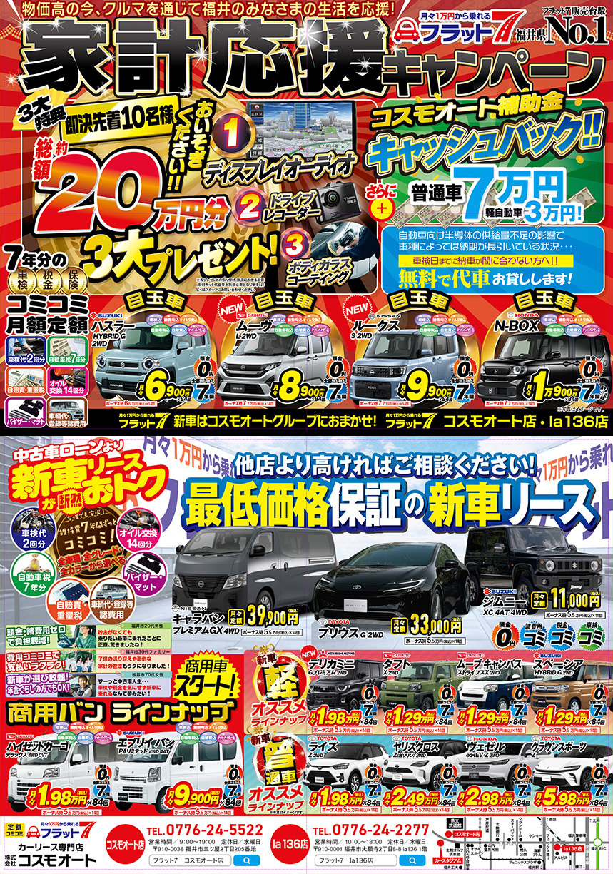 福井市 新車販売 コスモオート オトクにクルマに乗る フラット7(新車定額リース) 中古車情報 コスモローン(自社ローン) オトクに車検 ウルトラ車検【WEB特典付き】 ウルトラ車検お見積り ウルトラ車検ご予約 選ばれる理由 仕入れから丁寧にメンテナンス 買った後も安心サポート スタッフ紹介 新着情報 2026年1月16日 軽自動車でも実現した自動運転技術:その現状と安全性向上効果を解説2026年1月15日 新車を安く乗り続ける秘訣:カーリースが向いている人向いていない人の分岐点2026年1月9日 エンジニアが解説する軽自動車の安全技術:原理から効果まで完全理解2026年1月7日 街乗りからレジャーまで!多用途で燃費の良い軽自動車カタログ2026年1月5日 軽自動車の購入を考えている人必読!ライフプランで変わるローンとリースの最適解 ただいま放送中のCM 自動車ローンに落ちてしまった方・不安な方はこちら 福井市 株式会社コスモオ-ト フラット7 コスモオート店・la 136店 フラット7の魅力!他店対抗価格勝負!